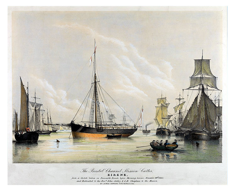The sloop "Eirene" of the Missions to Seamen moored with others off Penarth Head in November 1843. She was the first ship for the Mission based at Penarth which was built at Pill on the river Avon commencing 1839, and she was launched in 1840, specifically for Rev. Dr. John Ashley's 'roadstead' ministry. She had chapel accommodation below deck for 60 - 70 men which often reached around 130 men!