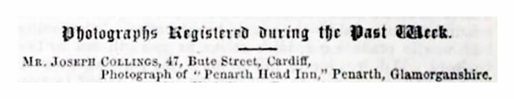 October 1864 - The above entry within The Photographic News provides an accurate date for the photograph(s) of the Penarth Head Inn and confirms Mr. Joseph Collings of 47, Bute Street, Cardiff was the photographer. - The Photographic News Vol.VIII.[1206] [499] 14th October 1864.