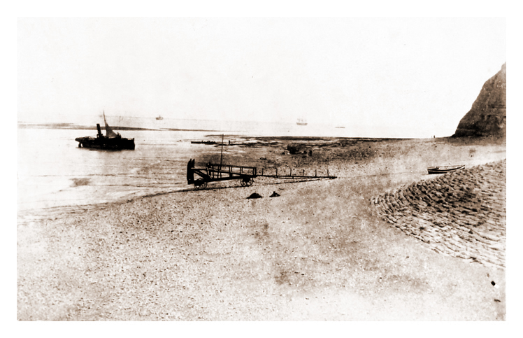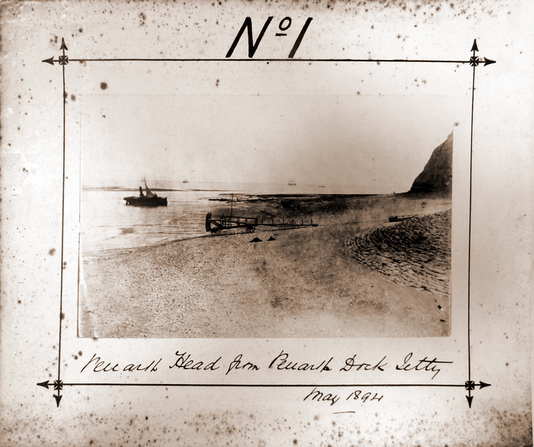 • May 1894 - Penarth Head from Penarth Dock Jetty. A copy of a gorgeous photograph (tinted to soften the photocopy!) of the Penarth Dock Beach at low tide with its stone pitching, long washed away, protecting the beach and Marine Hotel, etc. Centrestage is the mobile passageway used for passengers to board the Penarth Ferry on their way to Pier Head, Bute Docks, Cardiff or in summertime, the Penarth Beach. A steam vessel is aground awaiting the tide and the end of Penarth Head may be seen on the right of the image.