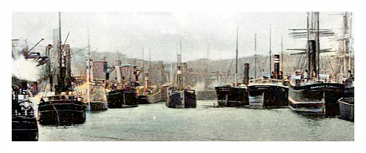 A sepia tone and a colourised enlargement of the busy dock entitled 'The Docks, Penarth' taken from the eastern end, undated, but probably c.1910. This postcard is from the Penarth Dock Collection [001] and was published in Penarth by W. A. Stephens, Noah's Ark, Windsor Road.