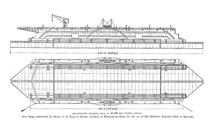 The designers, Clark & Standfield produced a pamphlet [020] for the US market expounding the virtues of the floating dock or pontoon over the fixed installation of a graving dock, otherwise known as a dry dock. "The following cut illustrates the Floating dock that we at present designing for the British Admiralty, and which is to be placed at Bermuda, Messrs. Swan & Hunter being the constructors. The length of this dock is 545' - 0" (166 m) over the keel blocks, its width of entrance 100' - 0" (30.5 m), and it is capable of normally taking vessels drawing 33' - 0" (10 m) of water over keel-blocks 4' - 0" (1.2 m) high . . . Its lifting power up to the pontoon deck level is 15,500 tons, but by utilising the pound formed by the bulwark surrounding the pontoon decks, additional lifting power can be gained. The engine power of this dock is sufficient to lift an ironclad displacing 15,000 tons in three and a half hours. It is being built on the Tyne, and, when completed and tested there, will be towed to its destination as a complete structure." |