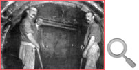 We now have a circular aperture of slightly greater diameter than the ring so the shield is now retracted into the tail section and the segments are assembled with nuts and bolts. Heavy gauge lead wire filament is fed into a groove machined in the flanged faces of each of the segments and at the vertical flanged faces. Tightening the nuts and bolts sequentially provides a watertight seal between the machined faces of the segments in a ring and between each ring. Another common sealing medium was 'rust cement', or rather iron filings mixed with sal ammoniac. The annular gap of 2" (5 cm) around the ring was pumped with concrete grout to fill the gap and provide additional sealing. The construction gang worked behind an air lock since the shield area was pressurised to counteract the hydrostatic (water) pressure outside and thus to prevent or limit the ingress of water to the workings. Air was supplied through pipelines leading to a steam powered compressor at the surface. The pressure inside the shields would be progressively increased as the depth of the tunnel increased and/or as the tide above rose. It had to be carefully balanced since the increased air pressure had implications for the health of the workers and there was always the risk of the compressed air pressure overcoming the resistance from the surrounding ground with a sudden blow-out resulting. To prevent this occurring, a surcharge of spoil was dumped into the river above the excavation much to the annoyance of local mariners!