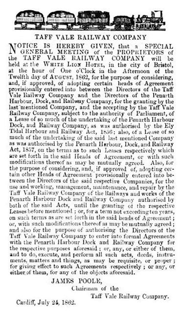 [156] [361] of a Special General Meeting to be held in Bristol on the 12th August 1862 to approve Heads of Agreement regarding a Lease between the TVR and the Penarth Harbour Dock and Railway Company. During this meeting, the Penarth Company agreed