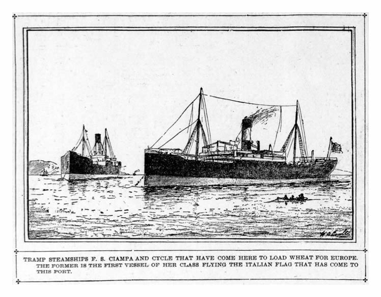 An illustration taken from a San Francisco newspaper published during September 1901 of the Italian steamship 'F. S. Ciampa' and the British steamship 'Cycle'. The 'Ciampa' was apparently 25 days coming from Talcahuano, Chile and is of 4,040 tons gross and 2,634 tons net burden. She was built in Genoa, Italy, in 1899, by N. Odero and Co. and is 340 ft. 5 in. long with a 45 ft. beam and is 19 ft. 8 in. deep. 'Captain Cafaiero, who commands her, has scores of friends in this port, as he traded here for years in the ship 'Francesco Ciampa.' - San Francisco Call [839] 22nd September 1901.