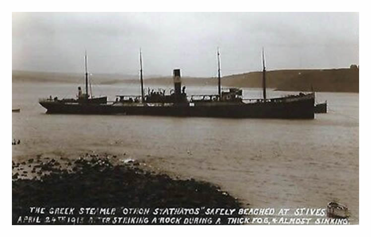 St. Ives, Cornwall.—A large Greek steamer named the Othon Stathatos, of Ithaca, carrying a crew of twenty-three hands, and bound from Penarth to Athens with a cargo of 6,000 tons of coal, struck a submerged rock about two miles north of Pendeen and commenced to settle down early in the morning of the 24th April. The wind was blowing moderately from the S.S.W., there was a rough ground swell, and the weather was very thick with rain at the time. Information of the disaster reached St. Ives at about 5.30 a.m., and with very commendable promptitude the Life-boat James Stevens No. 10 was sent to the assistance of the vessel.