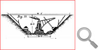 The gullet thus made may be 20 ft. or even 30 ft. deep, according to the nature of the stuff ; but 25 ft. is about the most economical depth, because the machine has then sufficient reach to make the cutting exactly large enough for an ordinary double-line railway of standard gauge, the slopes requiring very little handwork to finish them, as shown by the section in Fig. 11. In Fig. 12 is shown a cutting 50 ft. deep for a similar railway, which can be best made by driving two navvies, one in advance of the other, to take out the first 25 ft. ; and then finishing the lower half of the depth with a gullet similar to that shown in Fig. 11. In each case the completed cutting is shown by the dark section, and the part to be taken out by hand by a light colour. In the deep cutting, Fig. 12, the sleepers and ballast of the permanent way are drawn in ; whilst in the other, Fig. 11, are shown the positions of the side roads while the work is in progress. |