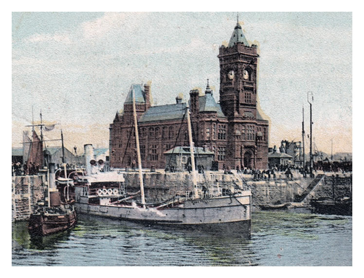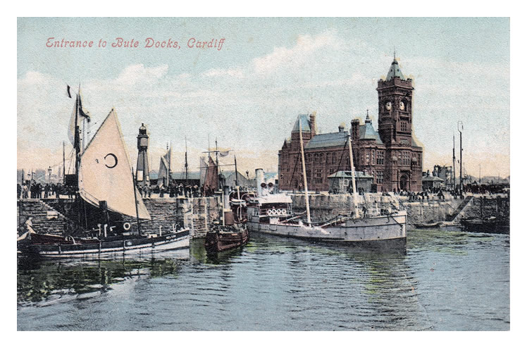 Entrance to Bute Docks, Cardiff - A Valentine's series postcard of a coastal vessel leaving the dock while a tug and a Cardiff Pilot await. The imposing, red brick, Dock Offices provide a time of 10 minutes to twelve but the date is lost in time. Another heritage postcard view held within the Penarth Dock Collection. [001] [20230225]