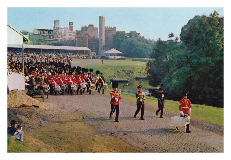 Cardiff Tattoo - 'The massed bands, preceded by their three Drum Majors and the Regimental Mascot who is such a favourite with the public, beat the retreat at Cardiff's ancient castle, which dates from 1093, though the earliest part of the existing building is late 12th century. Colour photograph by G. F. Heiron.' Another heritage postcard view held within the Penarth Dock Collection. [001] [20230227]