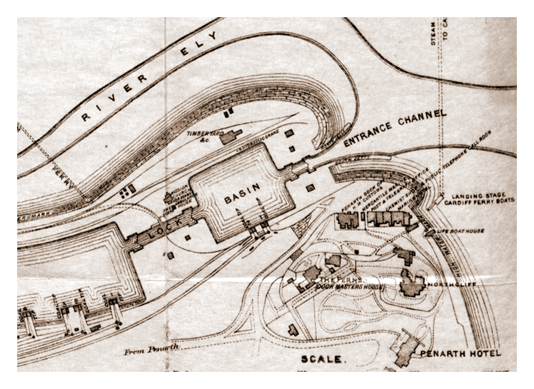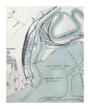 A circa 1865 map showing twelve tips and the ballast wharf of the Ely Tidal Harbour plus the Dock and Basin south of the river. Note the two railway lines to the Basin coal tips. These were the railways, docks and harbours of the Taff Vale Railway Company. Interestingly, the dock is shown with thirteen tips and is extended in length to the 1883 layout. There were only ten tips in the 1865 dock layout. This was possibly an earlier scheme which was not fully realised. [049]