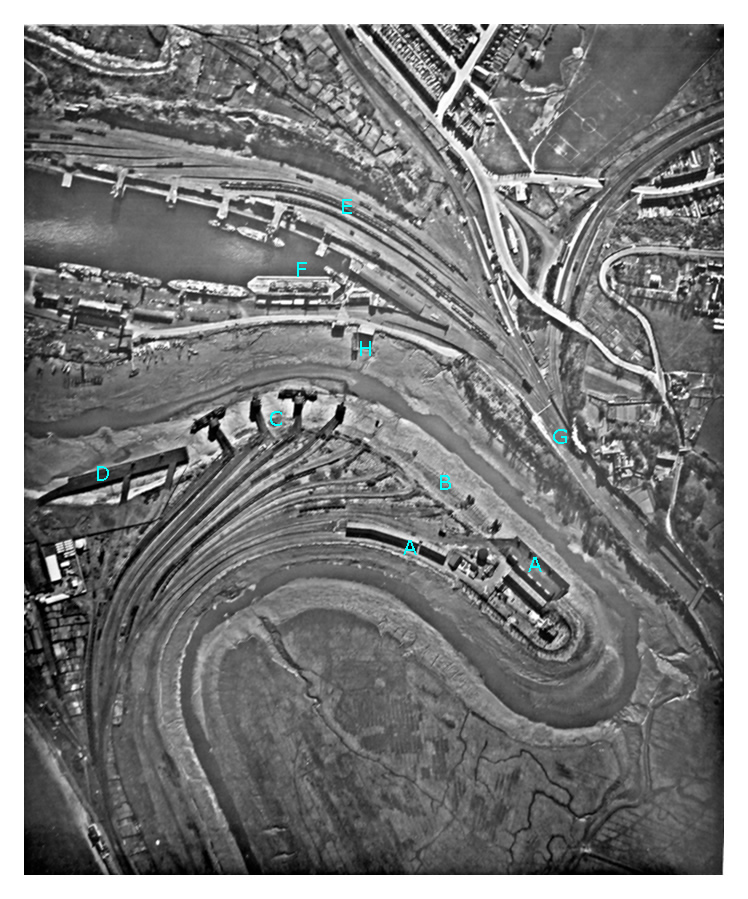 The Explosives Wharf [H] is adjacent to the building which is situated over the river on stilts. This is where I spent the final months of my apprenticeship in the drawing office on the first floor and where I met my wife, Julie.