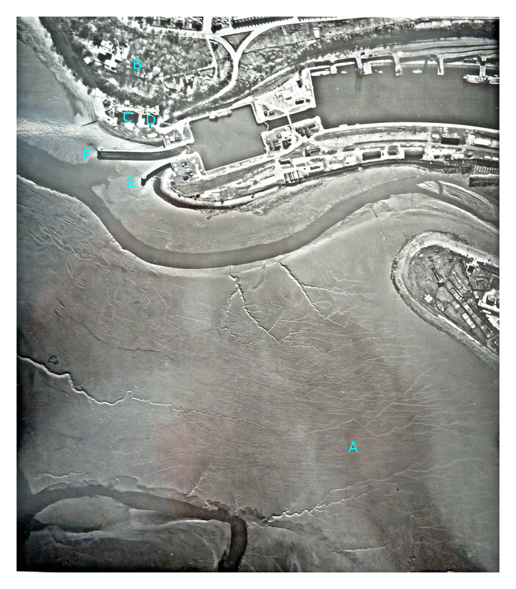 See also the entrance and exit of the subway [B]; the Missions to Seamen [C]; the remnants of the Patent Slipway [D] and the old timbers of the Gridiron [E].