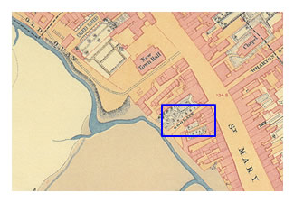 | late 1830's (or early 1840's) - A section of the town plan prepared for John Crichton Bute, Marquis of Bute, by John Wood, showing the extent of wharfage on the river Taff adjacent to St. Mary's Street, Cardiff. The 'Gwlat' wharf, though not indicated, appears to be situated at the rear of buildings and land which may have been used as warehousing, etc. At this date, however, the Glamorganshire Canal (fully opened June 1798), the Bute Ship Canal (West Dock) (opened in 1839 ) and Taff Vale Railway (opened to West Dock in 1841) are indicated on the plan, hence, the wharves on the Taff may have become less important and may have fallen into disuse. [599] |