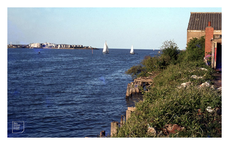 1984 - A photograph from the Mary Gillam Archive Project taken in May 1984 at the mouth of the River Ely. The 'old wharf' she describes was also probably part of the gridiron or wharfage associated with the Penarth Ship Building and Shiprepairing Company and is adjacent to the slipway.