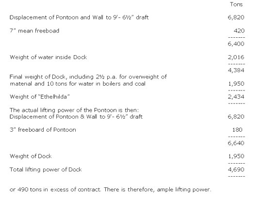 Volume Three - The Pontoon Era - The new pontoon commissioning and its early use . . . Pumping Trials: The Dock is required to lift a vessel of 4,200 tons displacement and of maximum draught of 18 feet within the space of time of 75 minutes, counting from the time the ship is centred on the blocks and pumping is commenced until the Pontoon deck is lifted out of the water, due allowance being given for any stoppage of machinery for the purpose of berthing the vessel. It was shown in the pumping calculations that to lift such a 4,200 ton ship of 18'- 0” draft, the amounts of water to be pumped and the work to be done are as follows:- |