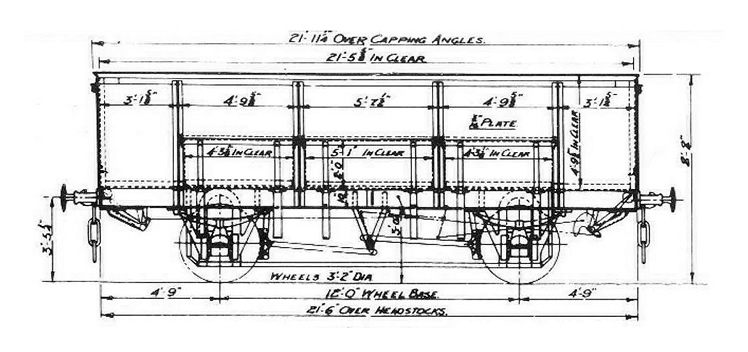 An enlarged front elevation of the 21-ton locomotive coal wagon which was a variant on the 20-ton (subsequently upgraded to 21-ton capacity). The wagon illustrated above has three side doors and no end doors for use on the coal tips of the Welsh ports but the overall dimensions and general construction is identical.